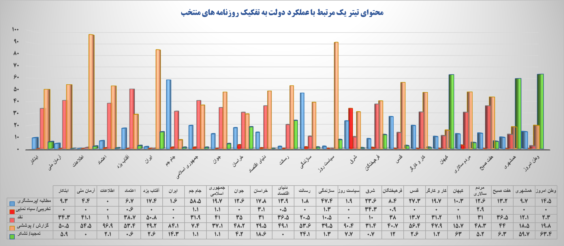 طبق این بررسی در دوره یکساله اخیر، بیشترین «تیتر یک» با محتوای تمجید و تشکر به روزنامههای دارای رویکرد سیاسی اصولگرا با ۸۸.۴ درصد اختصاص دارد. همچنین بیشترین «تیتر یک» با محتوای نقد با ۴۴.۹ درصد و تخریب با ۴۷.۱ درصد به روزنامههای دارای رویکرد سیاسی اصلاحطلب اختصاص یافته است.