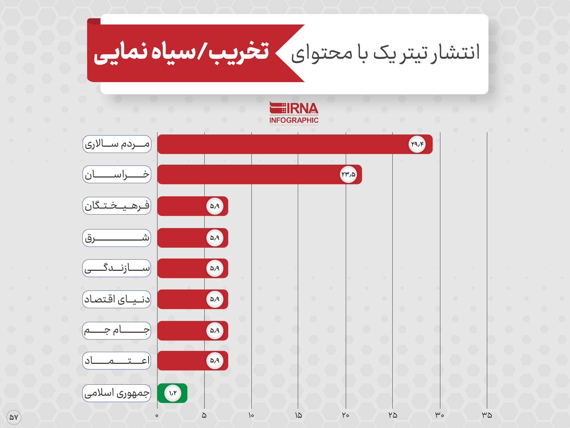 بیشترین «تیتر یک» تخریبی به دو روزنامه مردم سالاری با ۲۹.۴ و خراسان با ۲۳.۵ درصد اختصاص دارد و کمترین «تیتر یک» تخریبی به روزنامه جمهوری اسلامی با ۱.۲ درصد اختصاص دارد. البته مجموع تیترهای تخریبی ۱۷ مورد بوده که از این تعداد ۵ مورد مربوط به روزنامه مردمسالاری و ۴ مورد روزنامه خراسان است.